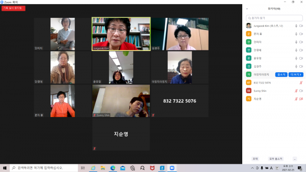 국제여성교류협회(WKIC)는 2021년 2월 25일 목요일 오후 3시 2021년 제1차 이사회를 개최했다. 이번 이사회는 코로나-19 확산방지를 위한 사회적 거리두기의 일환으로 비대면으로 진행됐으며 김정숙 대표, 이민지 공동대표를 비롯하여 12명이 참석했다.