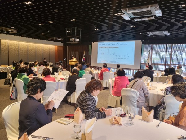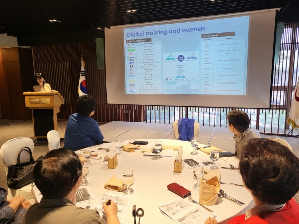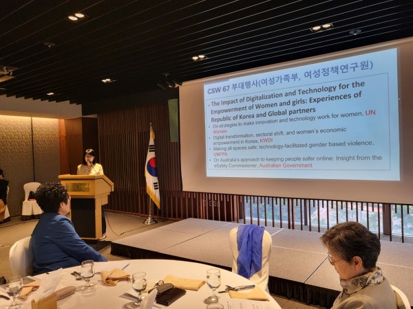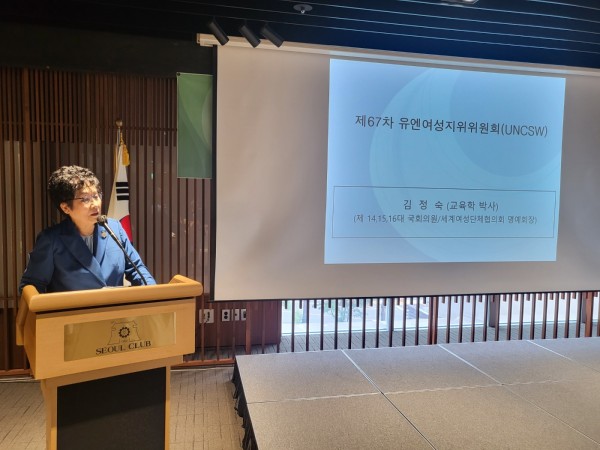 김정숙 국제여성교류협회 대표는 디지털 변화의 세계적인 흐름과 유엔여성지위위원회에 대해 간략히 설명하고 특히 이번 유엔여성지위위원회에서 디지털 성별격차가 주제가 된 배경과 67차 유엔여성지위위원회에서 다루어진 내용을 간략히 설명했다.
