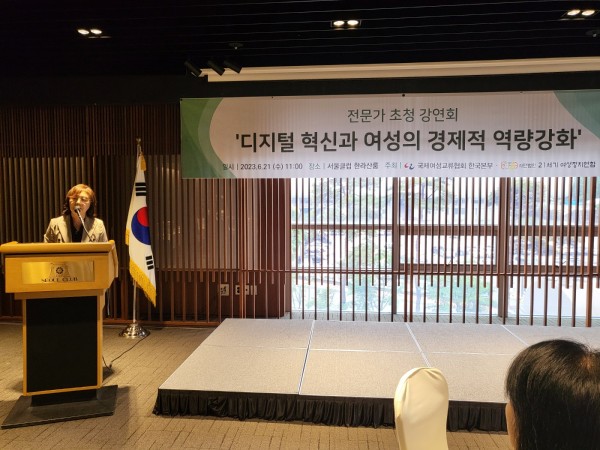 국제여성교류협회는 2023년 6월 21일 전문가 초청 오찬강연회를 개최했다. 이번 오찬강연회의 주제는 '디지털 변혁과 여성의 경제적 역량강화'로 디지털 성별격차(Digital Gender Divide)는 전세계적으로 중요한 여성 이슈로 대두되고 있는 주제이다. 지난 3월 뉴욕에서 열린 제67차 유엔여성지위위원회(UNCSW67)의 주제도 '여성과 소녀들의 역량강화를 위한 디지털 시대의 혁신과 기술변화 그리고 교육'이었다.