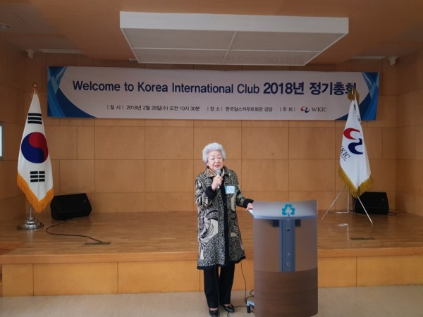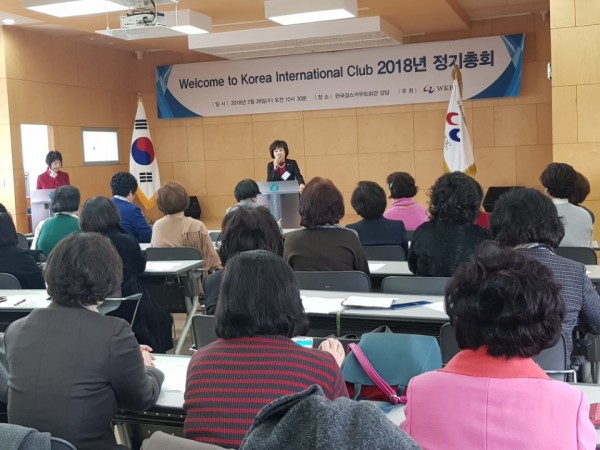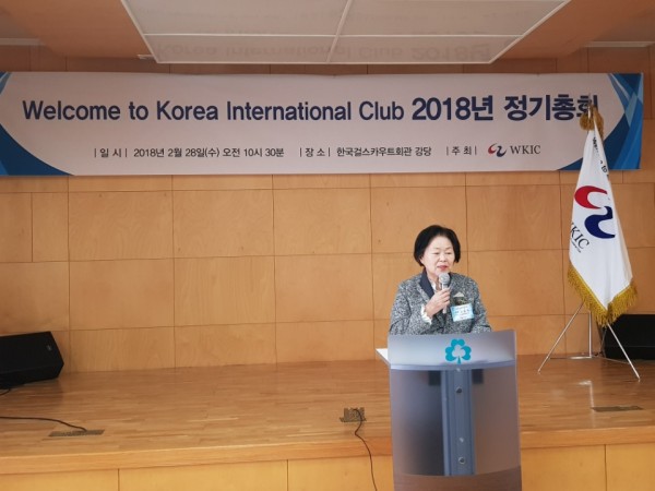 Welcome to Korea International Club은 2월 28일 걸스카우트회관 10층 강당에서 2018 정기총회를 개최했다. 문송희 회원의 사회로 성원보고 및 국민의례 후, 김정숙 회장이 개회인사를 하고 김순례 국회의원이 평생교육과 양성평등의 캐치프레이즈를 내걸고 애쓰고 있는 김정숙 회장 및 WKIC의 노고를 치하하는 축사를 했다. 다음으로 축사를 한 최금숙 한국여성단체협의회 회장은 개헌시 공직에 남녀동수를 선출해야하는 필요성과 용기있는 여성들의 ME-TOO 운동 등을 통한 사회적 이슈들을 지속적으로 끌고 나가야하는 현실적 필요와 거기에서 WKIC의 발전과 노력이 있어야함을 제시했다. 이연숙 전 정무2 장관은 축사를 통해 한국을 제대로 알아야만 바로설 수 있으니 늘 공부하고, 어떻게 보여줄지 연구해야함을 강조했다.