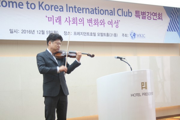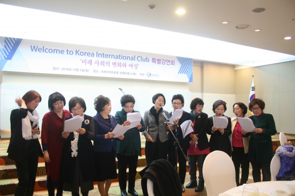 더불어 격려가 되는 송년 모임이 2016년 12월 5일 프레지던트호텔 31층 모짤트룸에서 60명이 회원이 참석한 가운데 이루어지다. 김정숙회장은 WKIC의 설립 목적 중 하나인 여성의 국제교류를 주도하는 리더쉽을 강조하였고, 미래변화를 전망하는데 도움이 되고자 ‘미래사회의 변화와 여성’을 주제로 미래학자 박영숙교수를 초청, 유익한 강의를 듣다. 또한 탈북 바이올리니스트인 정요한의 감미로운 연주후 오찬을 즐기다.